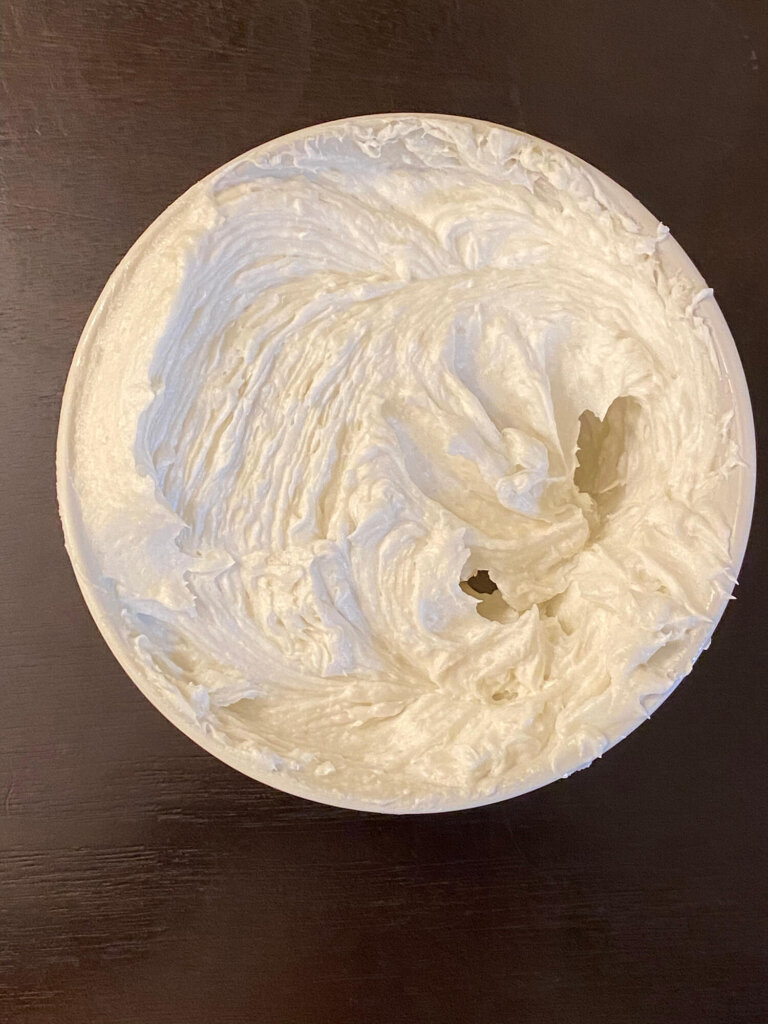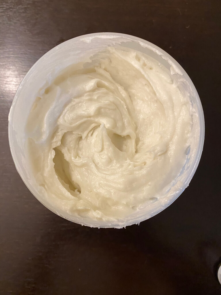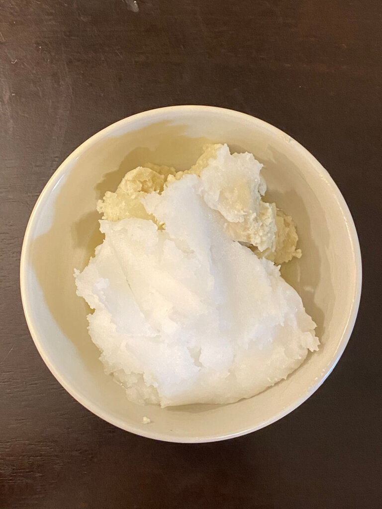 - Mix in coconut oil (not melted) using a mixer for 10 minutes until whipped & fluffy.